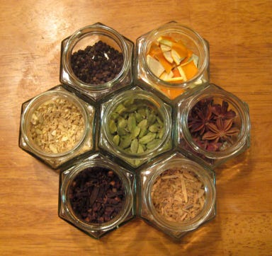 Red Chai, 3oz, use 1 1/2 t. per 8oz. - steep 5-6 minutes, this tea is more mild and sweet than our Constant Chai, though otherwise carries the same flavor punch. Tasty served hot with a spot of cream. Caffeine-free.